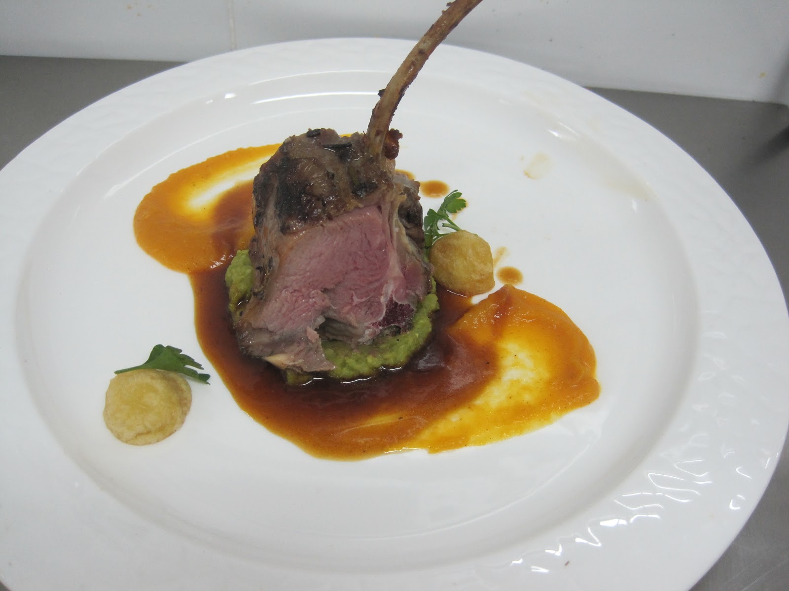 Main Course, Roast Lamb rack, pea and butternut puree, potatoes parisienne and Rooibos Jus